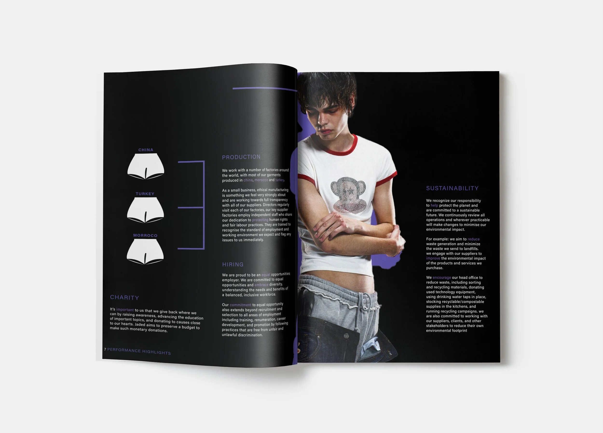 This Annual Report was designed to creatively highlight key factors such as inventory, stock levels, turnover rates, product demand, & supply chain efficiency, setting it apart from traditional reports. In doing so, I designed cutouts of various Jaded London models wearing the company’s most popular clothing. This approach added a stylish & engaging visual element to the report.